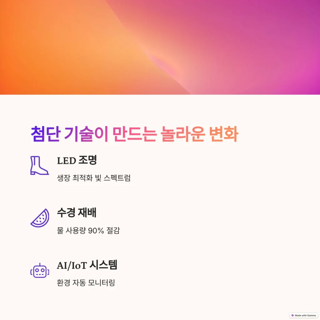 | 핵심 기술 요소 | LED 조명, 수경재배, 공기 제어, AI 및 IoT 시스템 |