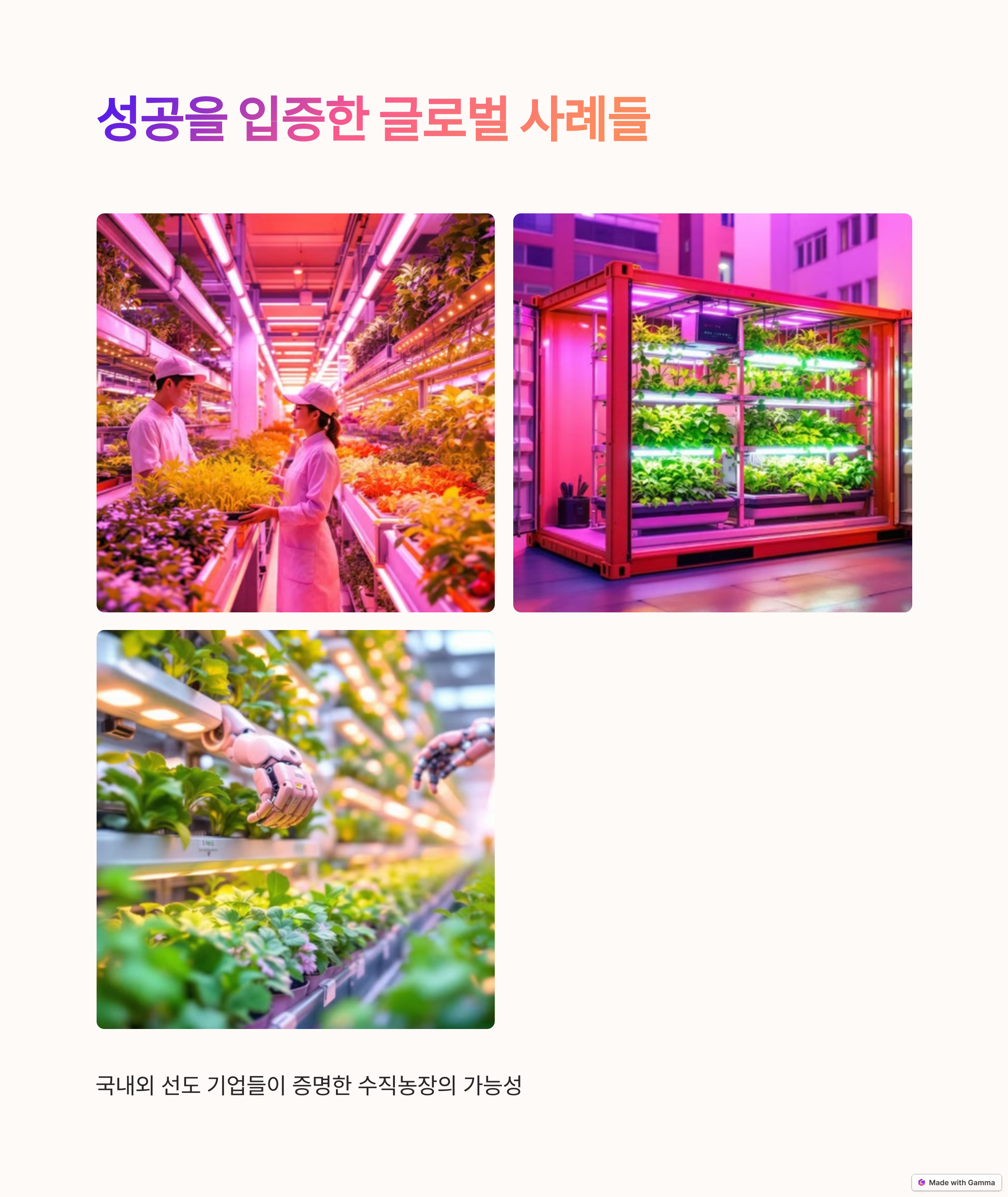 해외에서도 수직농장은 빠르게 확산되고 있습니다. 미국의 ‘에어로팜’은 세계 최대 규모의 수직농장을 운영하며, 에어로포닉 기술로 물 사용량을 95% 절감하고 일반 농업 대비 390배의 생산성을 달성했습니다. 일본의 ‘스프레드’는 로봇 자동화를 통해 연중 무휴로 작물을 생산하며, 독일의 ‘인팜’은 슈퍼마켓 안에서 실시간 재배 시스템을 운영해 소비자와의 거리를 최소화했습니다. 이러한 글로벌 성공 사례는 수직농장이 생산성, 지속가능성, 친환경성을 모두 만족시키며 미래 농업의 중심에 서 있음을 보여주고 있습니다.