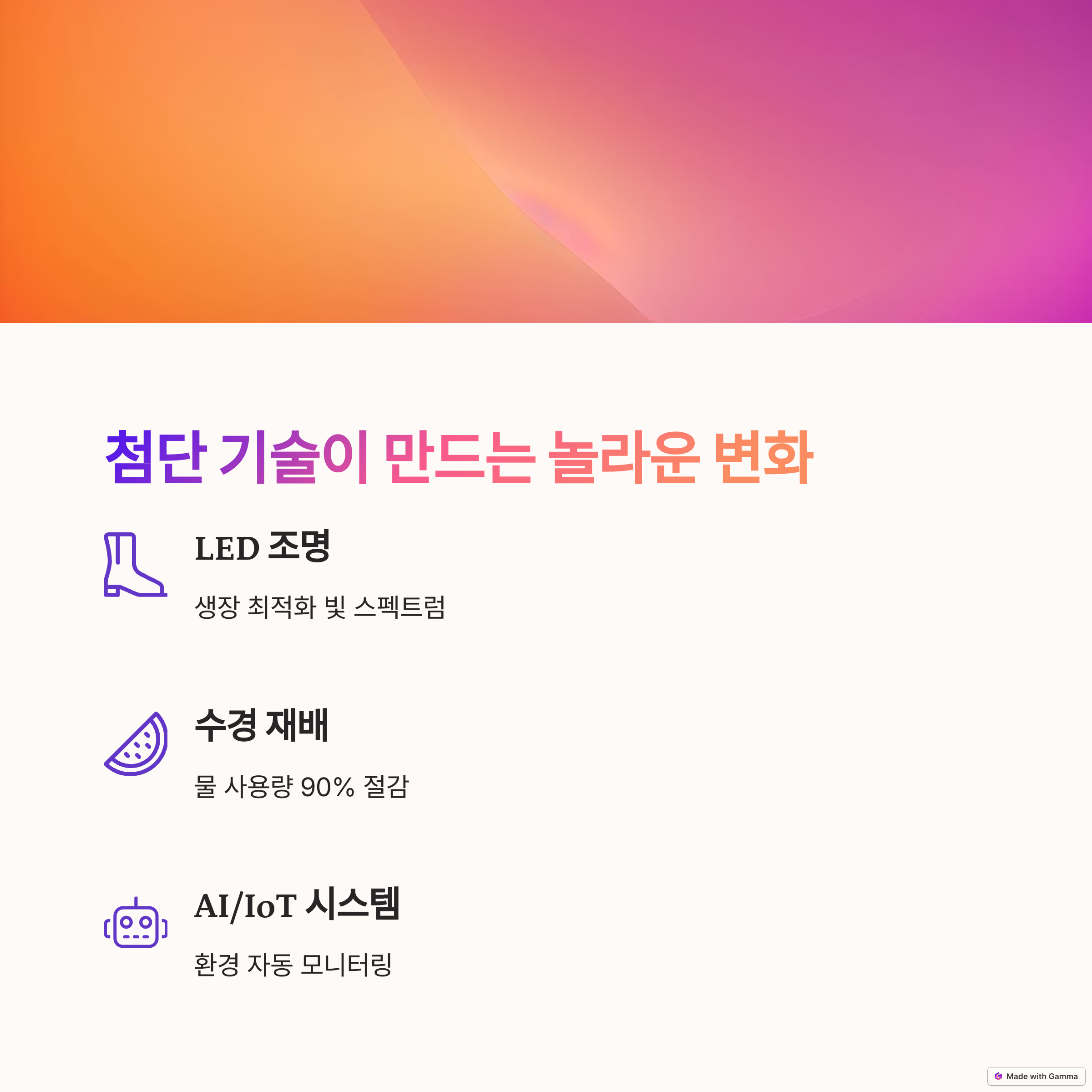 핵심 기술 요소 LED 조명, 수경재배, 공기 제어, AI 및 IoT 시스템