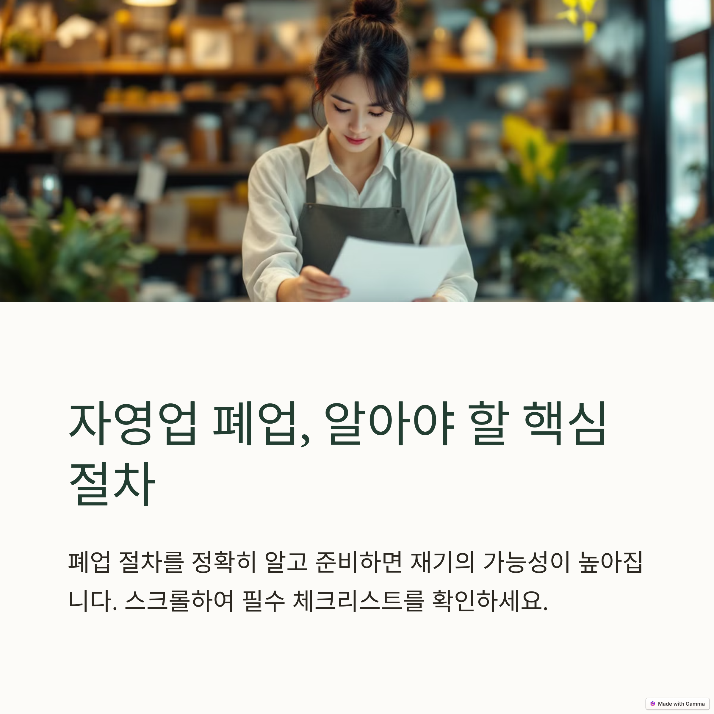 자영업 폐업은 감정적으로나 행정적으로 쉽지 않은 결정입니다. 하지만 필요한 절차를 하나하나 준비하고 정부의 지원 제도를 적절히 활용한다면, 그 여정은 훨씬 수월해질 수 있습니다. 폐업은 끝이 아니라 새로운 방향을 위한 터닝포인트일 수 있습니다. 본 글에서 안내해드린 절차와 체크리스트, 그리고 다양한 지원 제도를 꼼꼼히 참고하셔서 손실은 줄이고 다음 여정을 위한 발판을 잘 마련하시길 바랍니다. 무엇보다 중요한 것은 혼자 고민하지 말고, 관련 기관의 상담과 도움을 받는 것입니다.