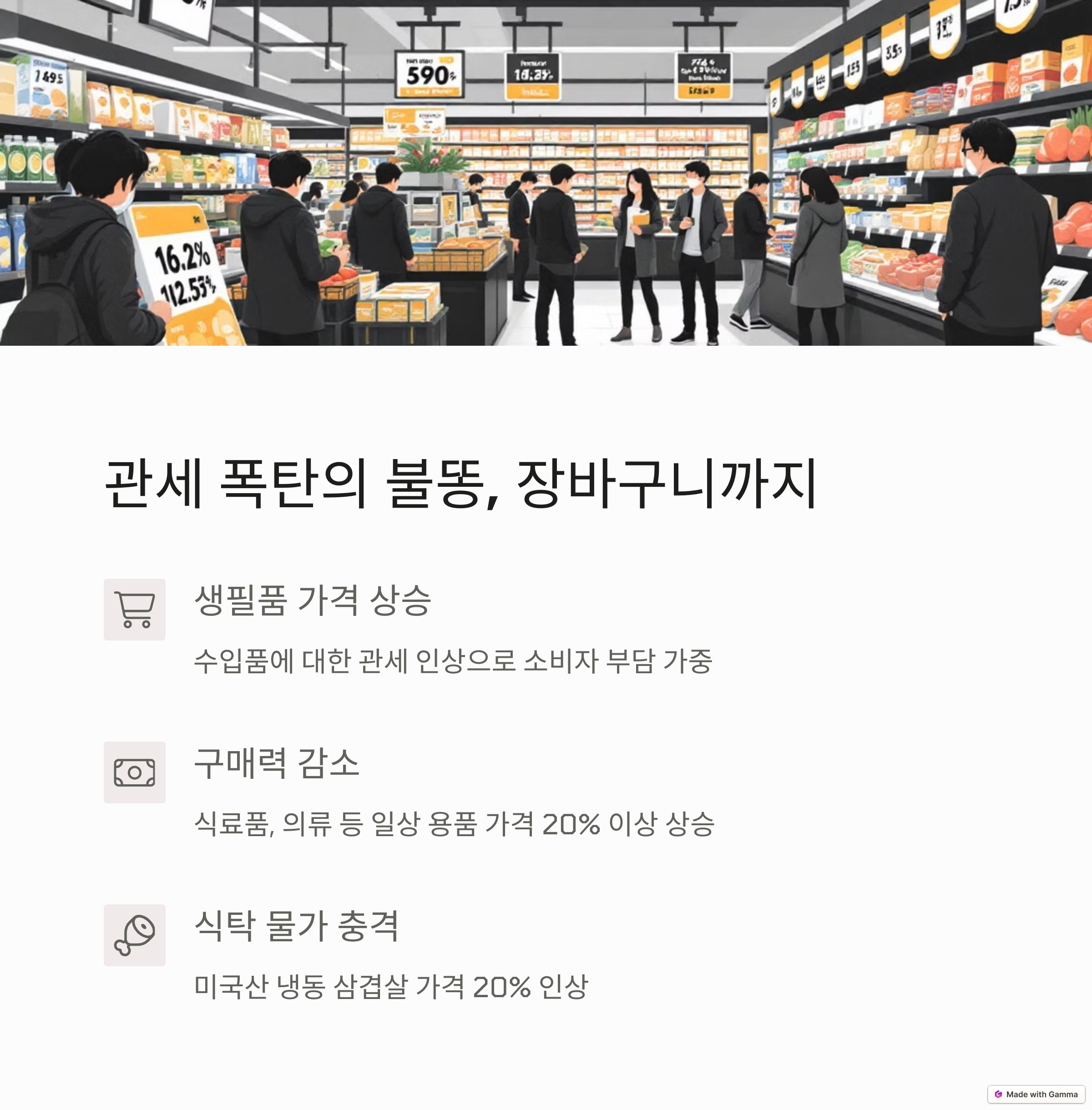 관세 인상과 공급망 혼란으로 인해 수입 제품 가격이 상승하고, 기업들이 비용 부담을 소비자에게 전가하면서 생활비 부담이 증가하게 됩니다.